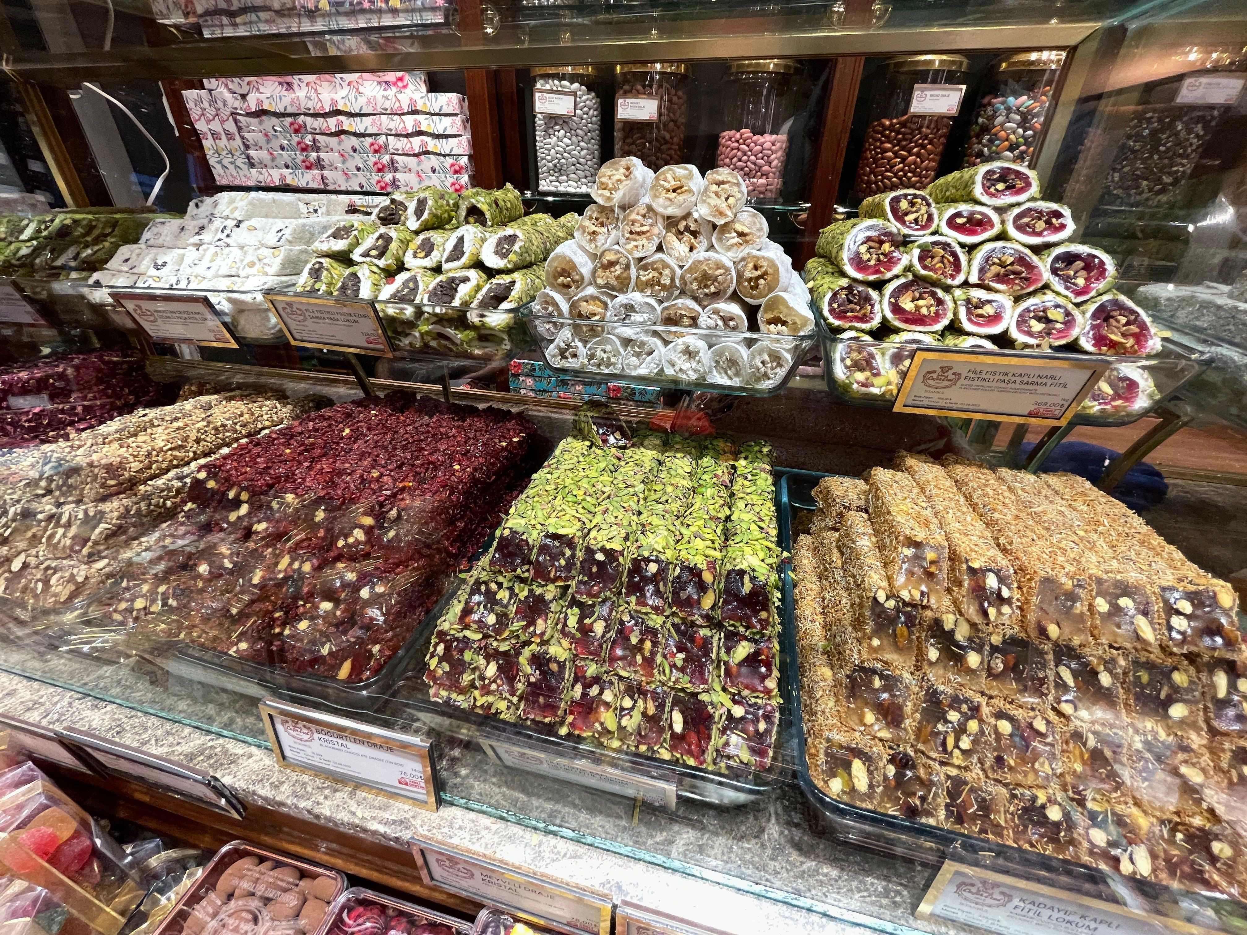 另一個土人很喜歡並出名的甜點就是英文裡的 Turkish Delights,土耳其文裡的 lokum,中文裡的土耳其軟糖。不論在禮品店、超市、點心店、甚至機場都買得到,絕對是最代表性的土耳其甜食。通常是小方塊的形狀,也有長條狀,裏裏外外都包各類堅果的,五顏六色的很吸引人。 但是絕對是甜死人,最後要配上土耳其紅茶或咖啡一起享用。