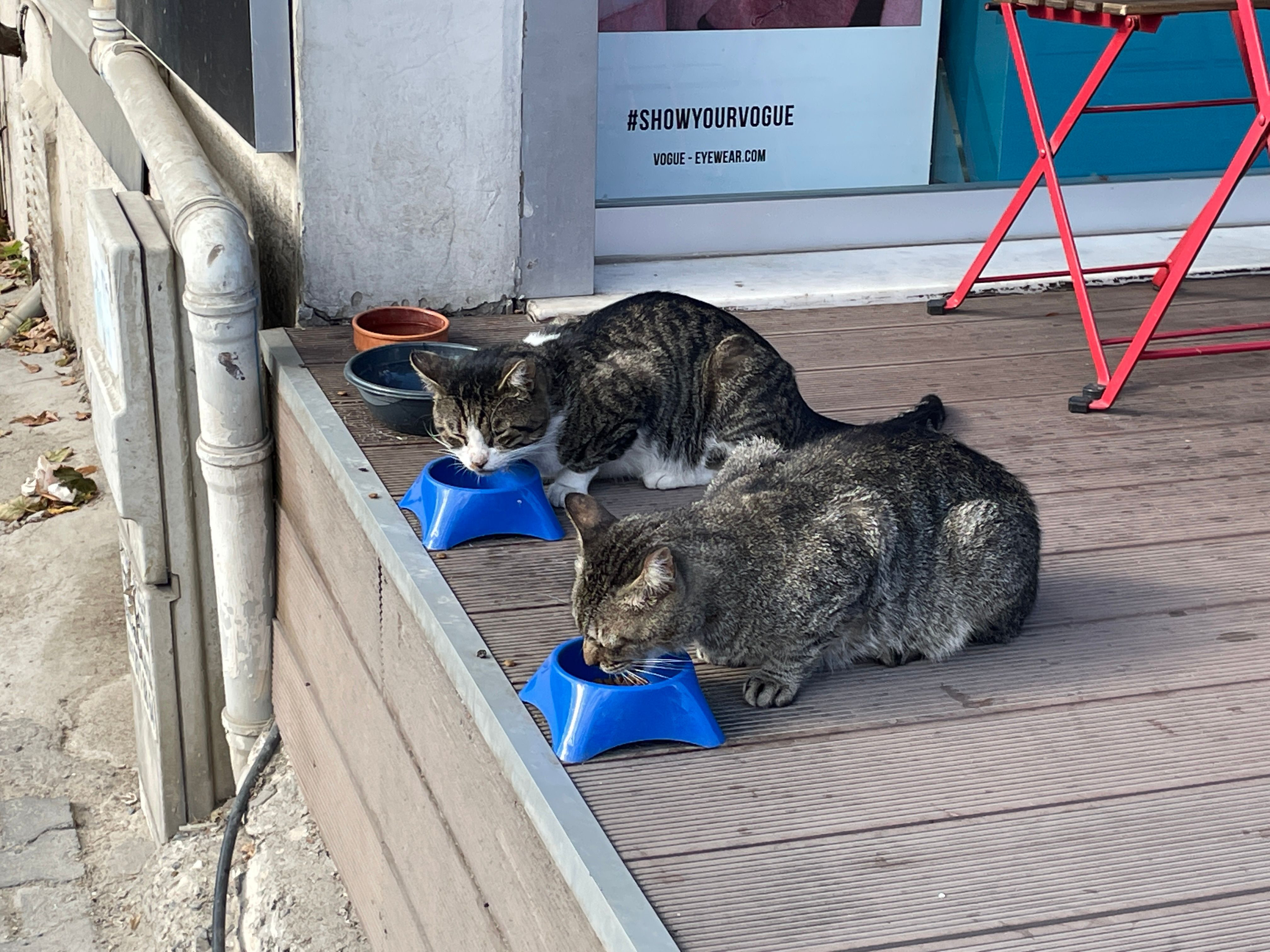 其實大部分的貓咪都是左鄰右舍在養,我們住的公寓旁,就有一整牆的紙箱貓屋,轉角的碗裡也通常有水和食物。我們也買了一包貓食,餵養了幾天附近的貓。
