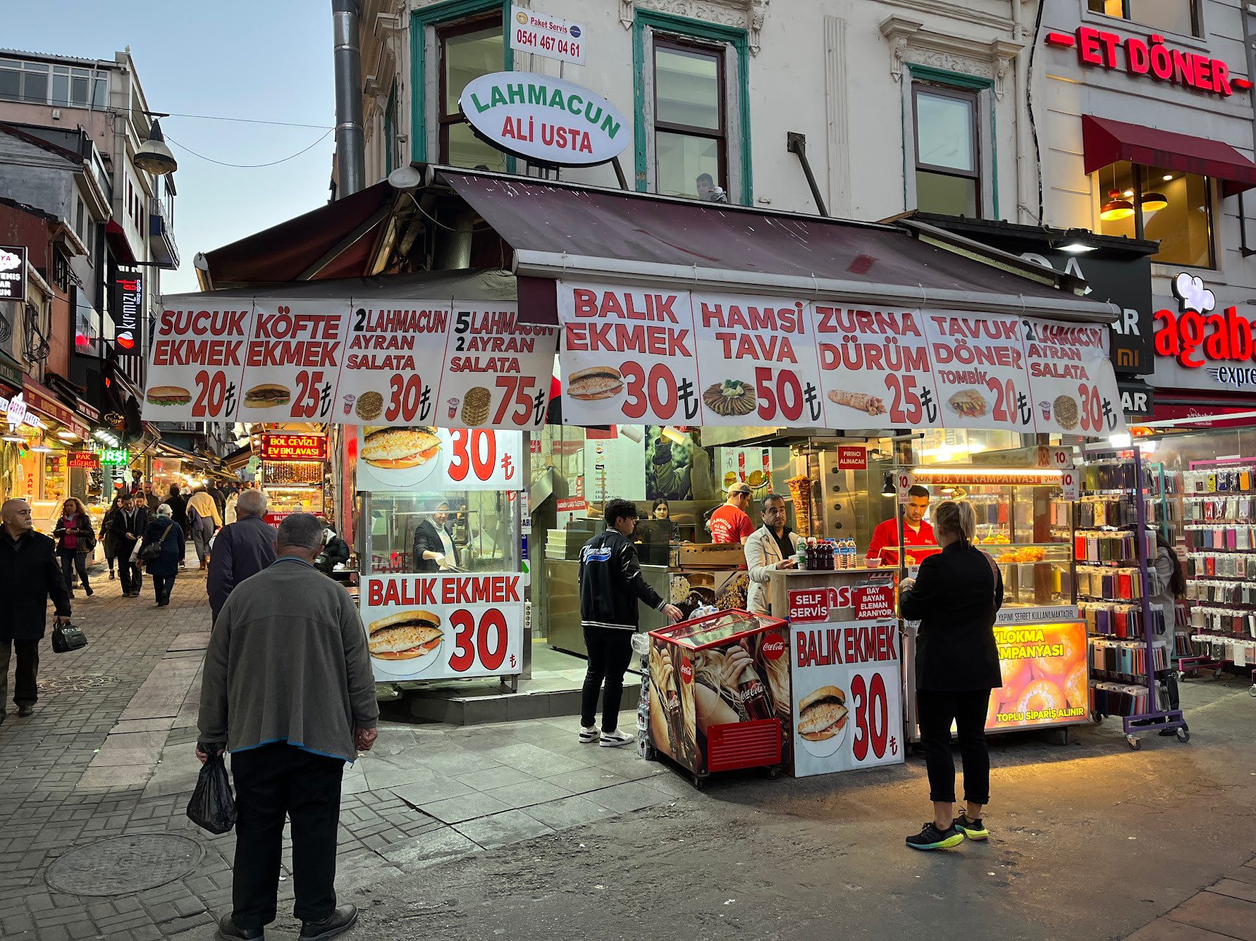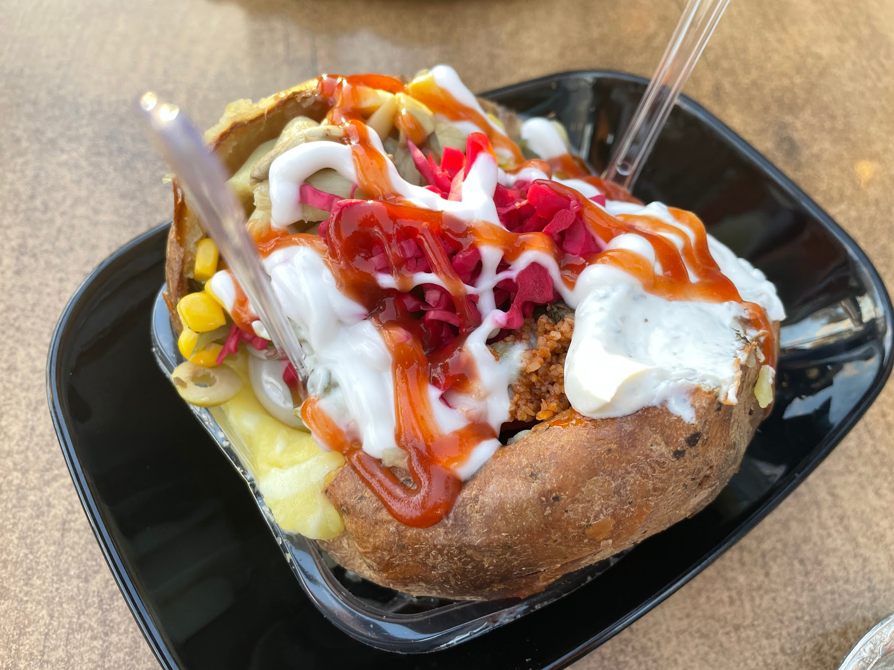 美國人愛吃的烤馬鈴薯,到了土耳其,變成料多實在的kumpir,一個人絕對吃不了這麼一大個烤馬鈴薯。 烤好的馬鈴薯拌進誇張份量的奶油,放上多種配料,有俄式沙拉、玉米粒、香腸、橄欖等的選擇,還擠上酸奶,整個熱量爆表,但吃了就停不下口。