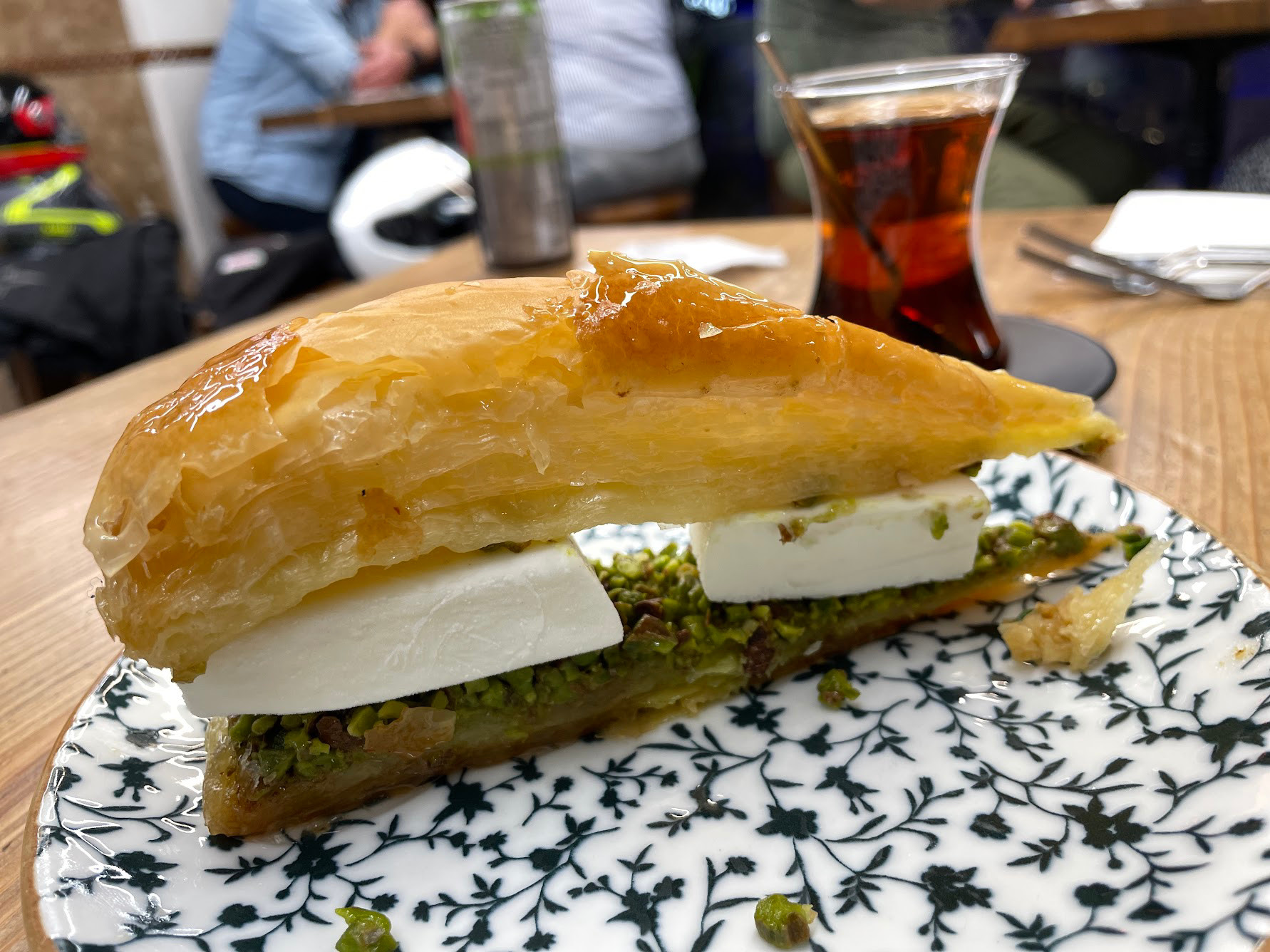 Tatlıcı Safa 也有賣 baklava,而且夾了土耳其冰淇淋在中間,很新鮮的吃法。但是我還是比較喜歡kunefe。座在二樓的雅座,一邊看著伊斯坦堡的車水馬龍,一邊吃甜點配紅茶,真是融入當地生活的一大樂趣。