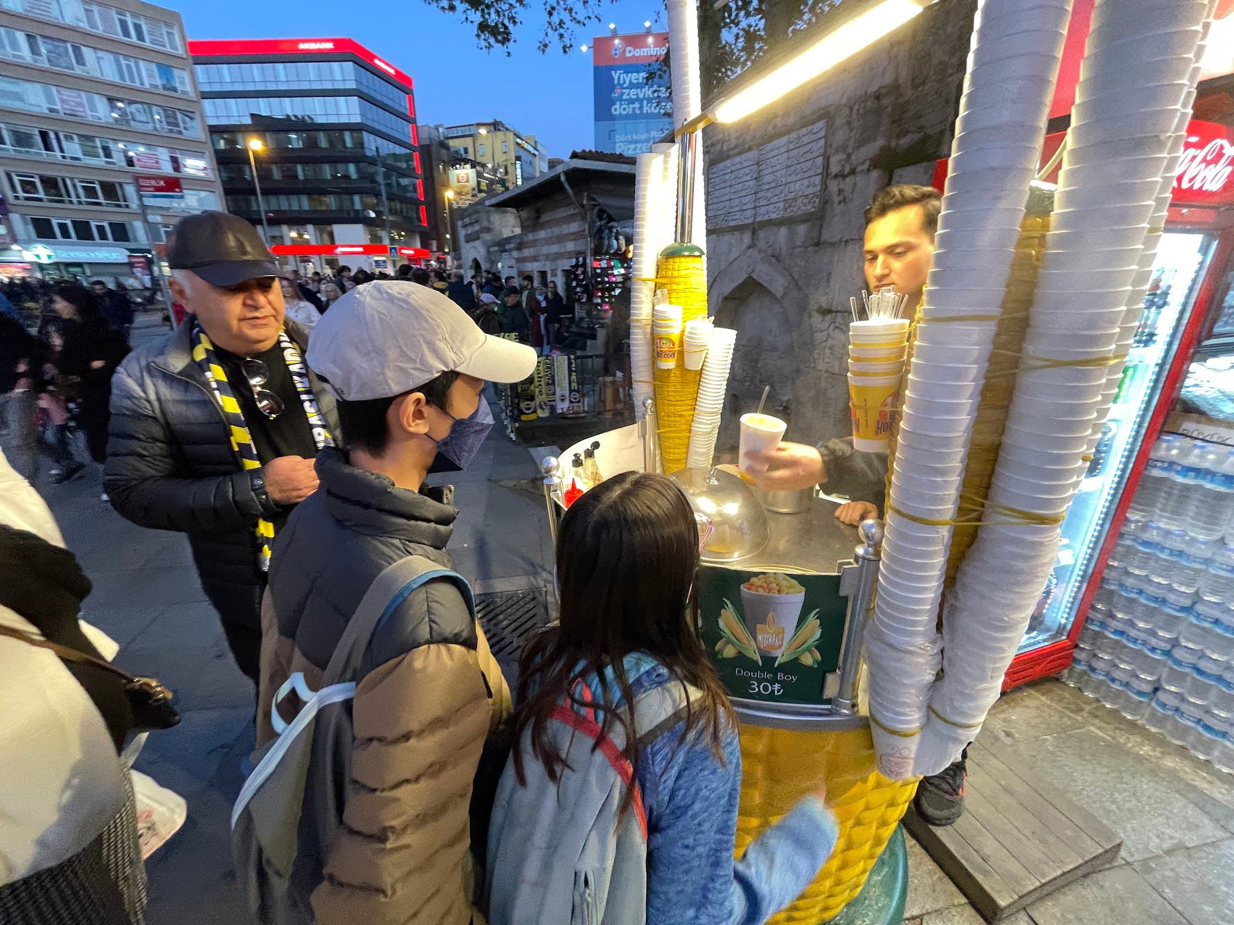 孩子們最喜歡的小吃則是玉米粒,裝在保麗龍杯裡,拿著小湯匙,邊走邊吃。玉米粒有調味,除了拌入奶油添加香氣外,小販會撒上香料,香甜可口的玉米粒騰著熱氣,在寒風中很難不愛上它。