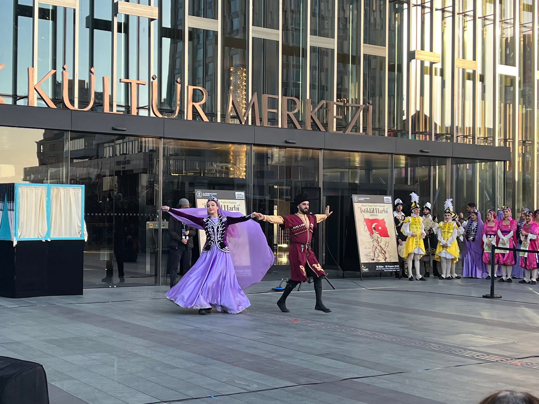那天運氣好,剛好碰到樂隊在路面電車上呼嘯而過,一行人鬧哄哄的站在懷舊電車上,從廣場沿著大街行駛。之後又在文化中心 (Atatürk Kültür Merkezi) 前看到民俗舞蹈的表演,表演一點也不馬虎,好幾套衣服,一下雙人舞,一下排隊形;一下踢腿拍膀子,一下拉裙子轉圈,很是精彩。