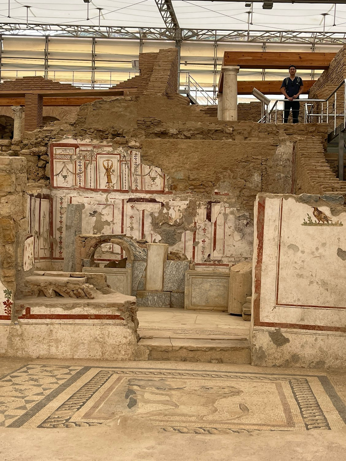 我們無意走進一區圍起來的遺跡,需要另外的門票,但是我們的博物館卡可以通行,就想都沒想的走進去。一進去,驚為天人,全是壁畫、馬賽克拼貼地板、大理石牆面,原來這裡是以弗所的豪宅,沿著坡蓋,有三、四層樓的住宅,裡面還有內院、水池、儲藏室等的設計,完全是出乎我們想像的奢華
