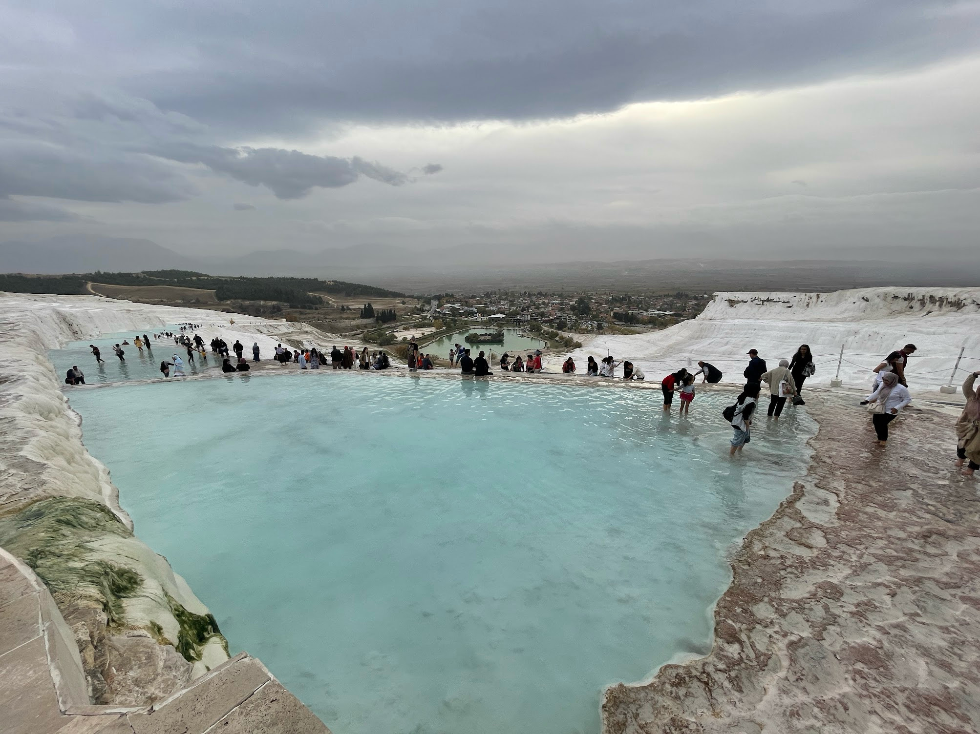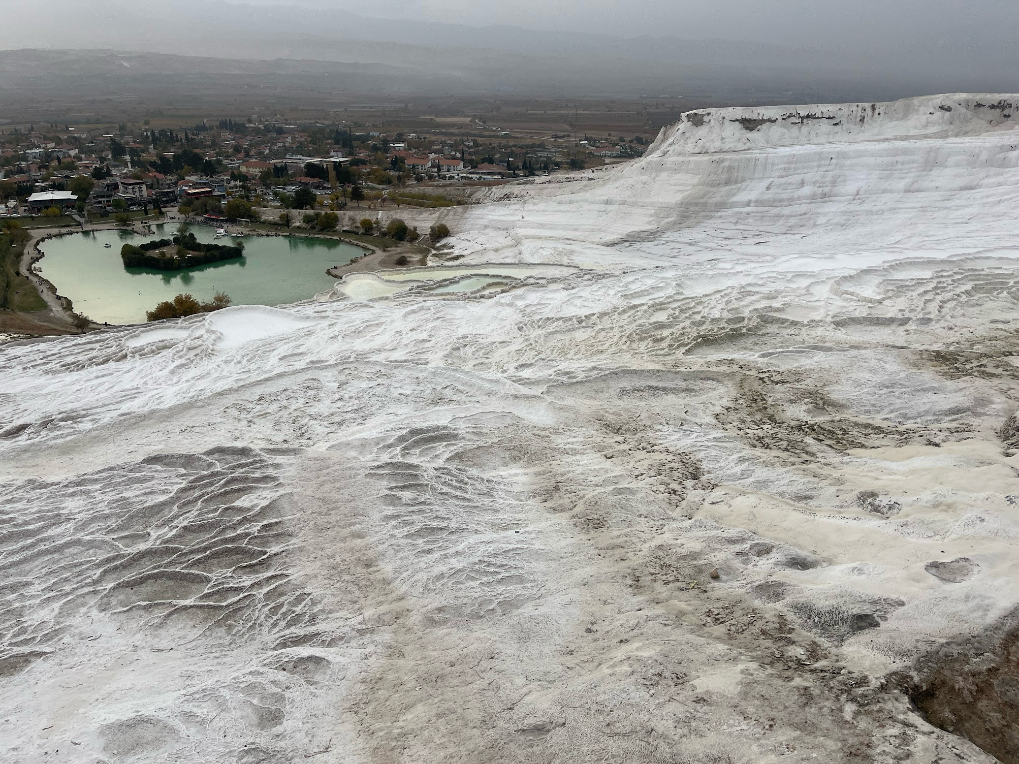 其實真實的棉堡景象讓我有些小失望,因爲之前土耳其政府沒有管制,讓業者建飯店、抽取溫泉水,又讓遊客穿鞋踩踏雪白的石灰岩,甚至還有人帶洗髮精、沐浴乳上去洗澡。現在的棉堡泉水大都枯竭,只剩小小幾灘給遊客泡腳,真是可惜!我們不想去人擠人、赤腳踩在鋒利的岩石上,就只在旁邊看看而已。