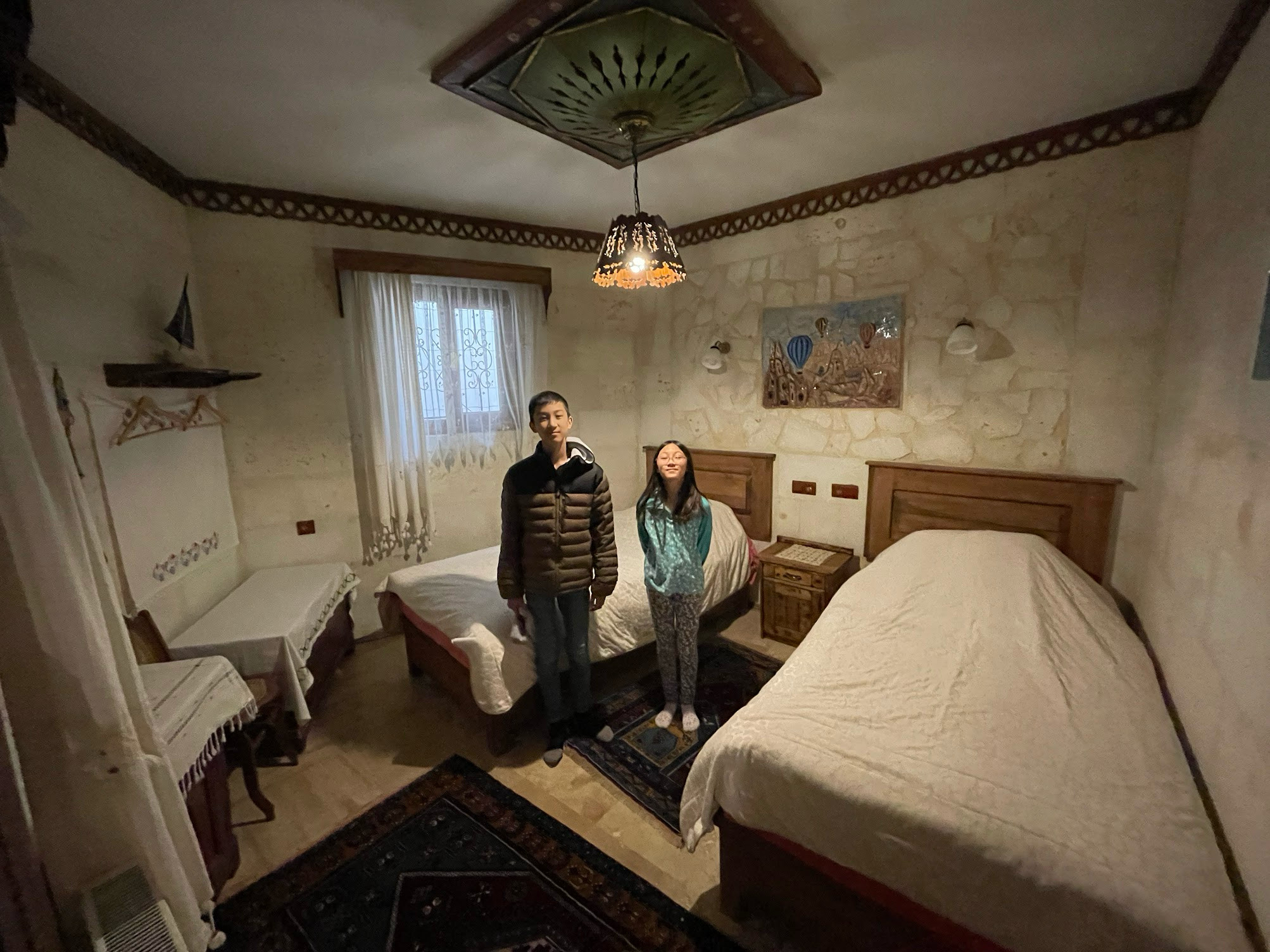 這個旅館鋪滿大理石,是所謂的洞穴旅館,我們貪便宜,選了一間離熱門的格雷梅稍遠的旅館,雖然看不到一早滿天熱氣球的打卡景,旅館內佈置得有格調,擺放的很多陶製的藝術作品,臨走時還送了我們幾個小陶偶。