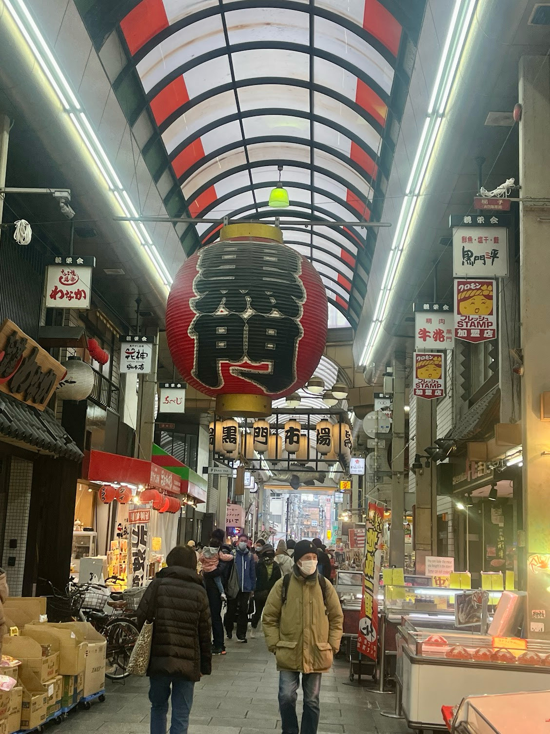 正事辦完,肚子也餓了,趕緊去黑門市場覓食,結果這個市場的觀光客比當地人還多,市場裡有很多海鮮可以吃,也看到新奇的河豚生魚片,切成薄薄的一片。轉車的時候,誤打誤撞到了阪急百貨的美食街,滿滿的人在選購精美的便當,每個看起來都很誘人,我們各選了一個回旅館享用