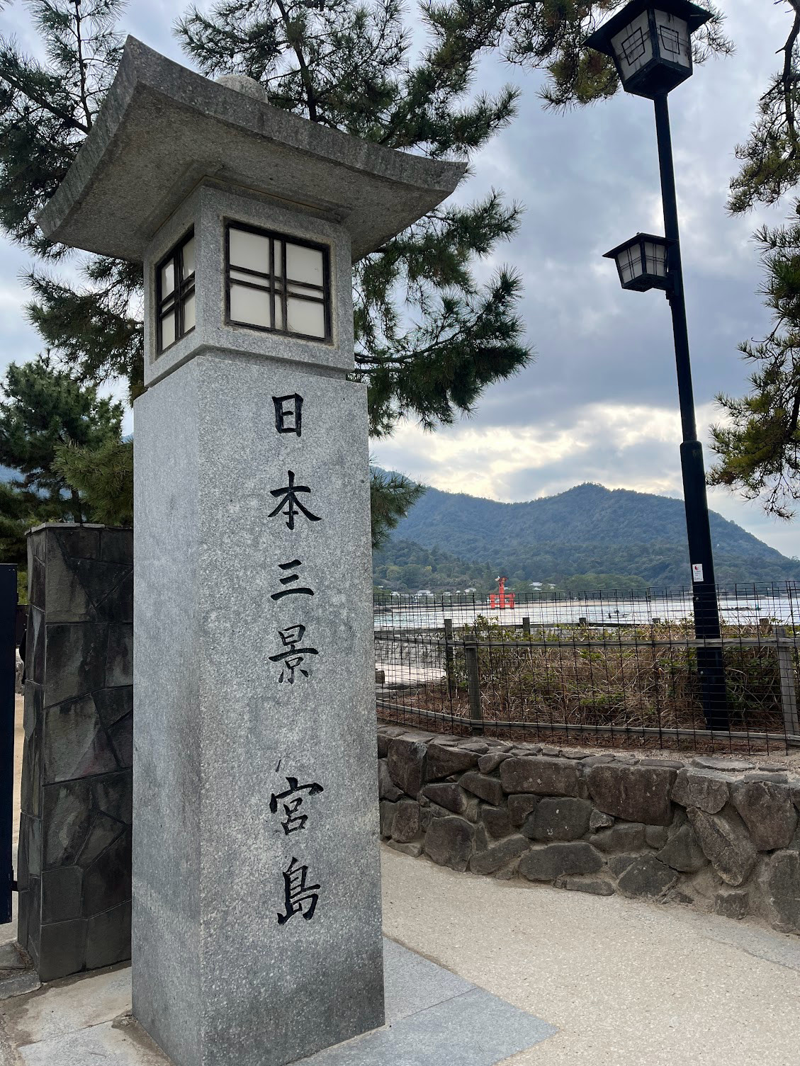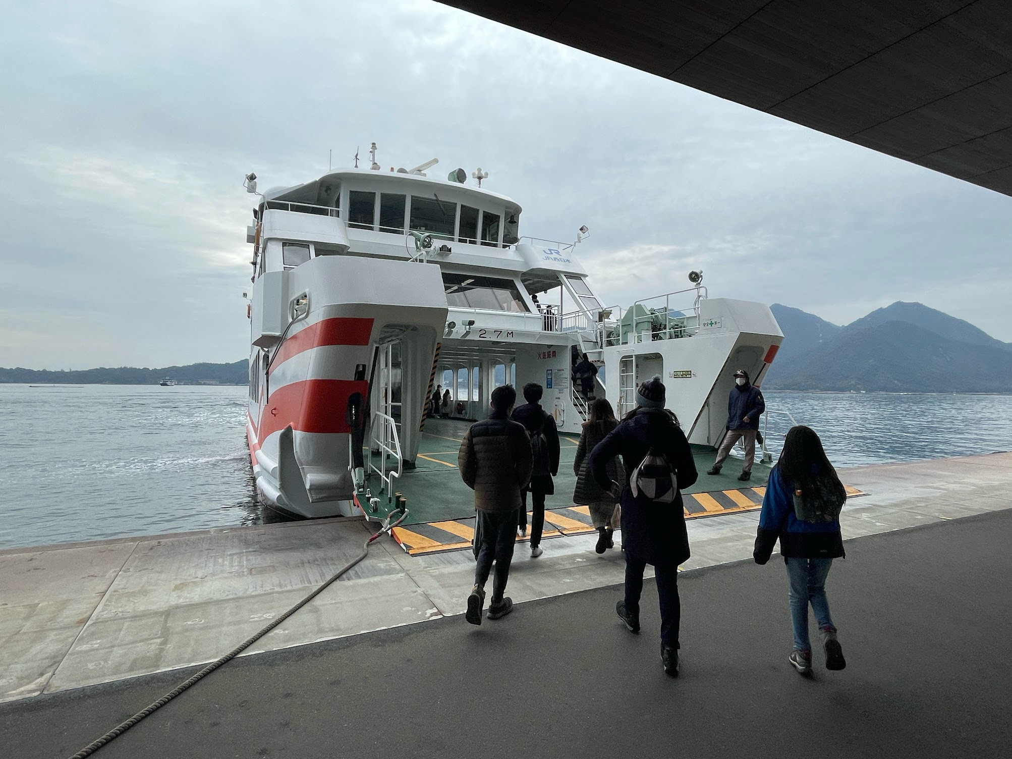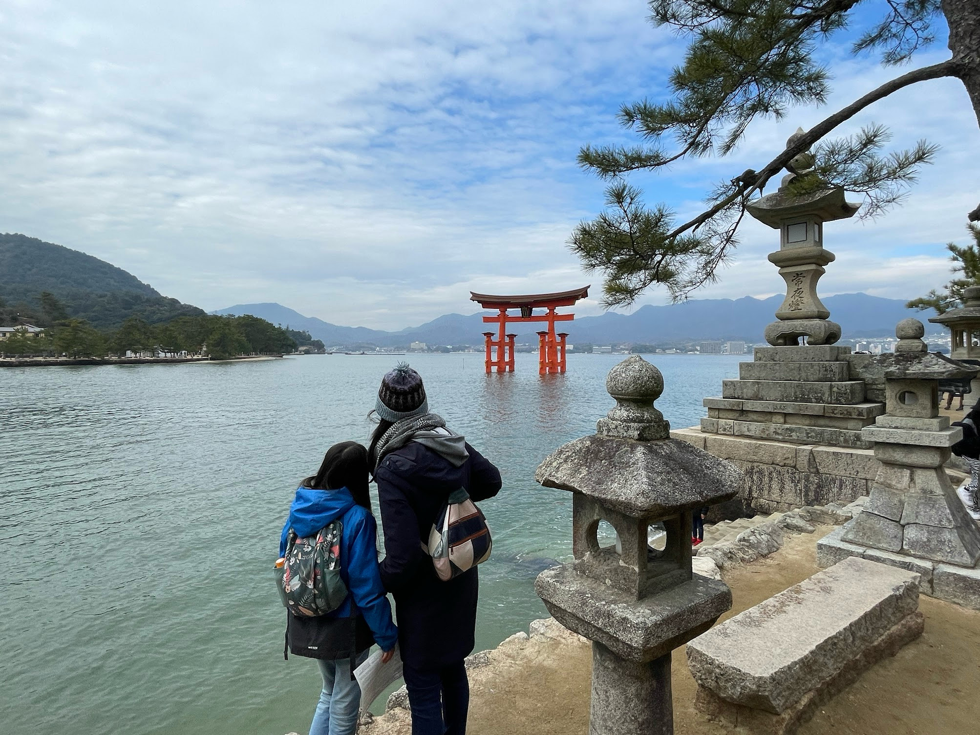 隔天前往日本三景之一的嚴島神社,這座1400年歷史的神社就建在廣島灣上的宮島,以佇立於海上的朱紅色鳥居而聞名,是宮島最具代表性的景觀。不僅是鳥居,就連嚴島神社本身也是建在海床上,漲潮時大鳥居和神社漂浮在海面上,彷彿仙境一般。我們需要在宮島口搭乘渡輪才能到嚴島神社,遠遠的就能看見泡在水裡的大鳥居,聽說當退潮時就可以走到沙灘近距離的觀賞海中鳥居。嚴島神社鮮紅的建築物漂在水上,配上遠處的青山綠水,呈現自然風光與美麗的建築相融相諧的迷人景色