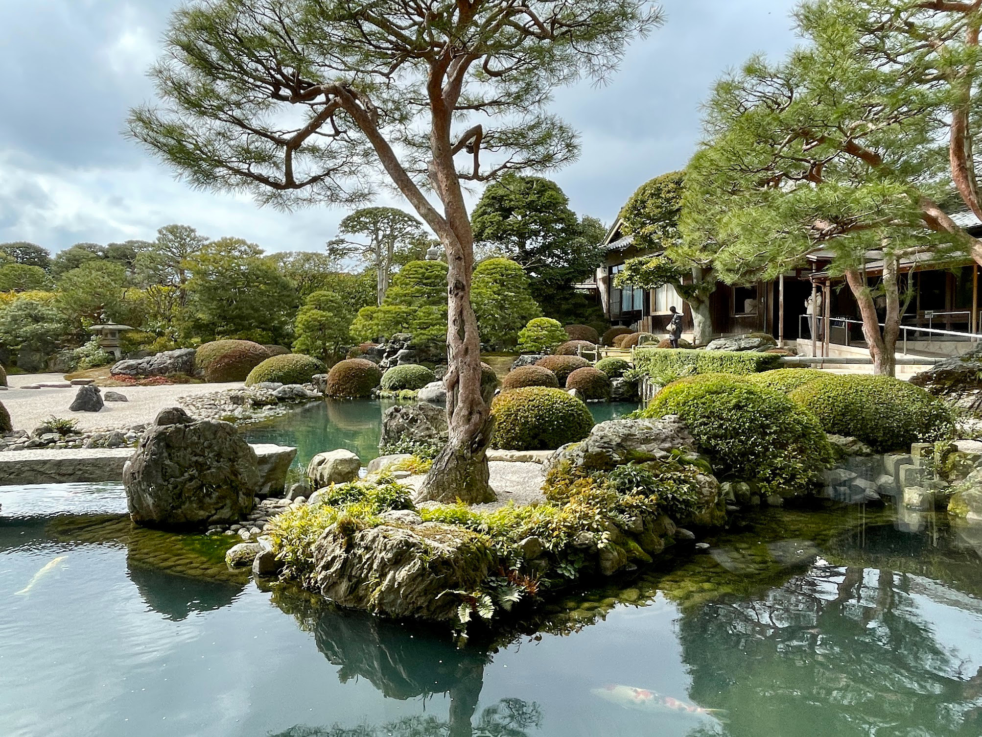 在足立美術館的庭園餐廳吃午餐,餐點簡單美味,坐在鯉魚池邊,看著精雕細琢的庭園,世界凝結般平靜。