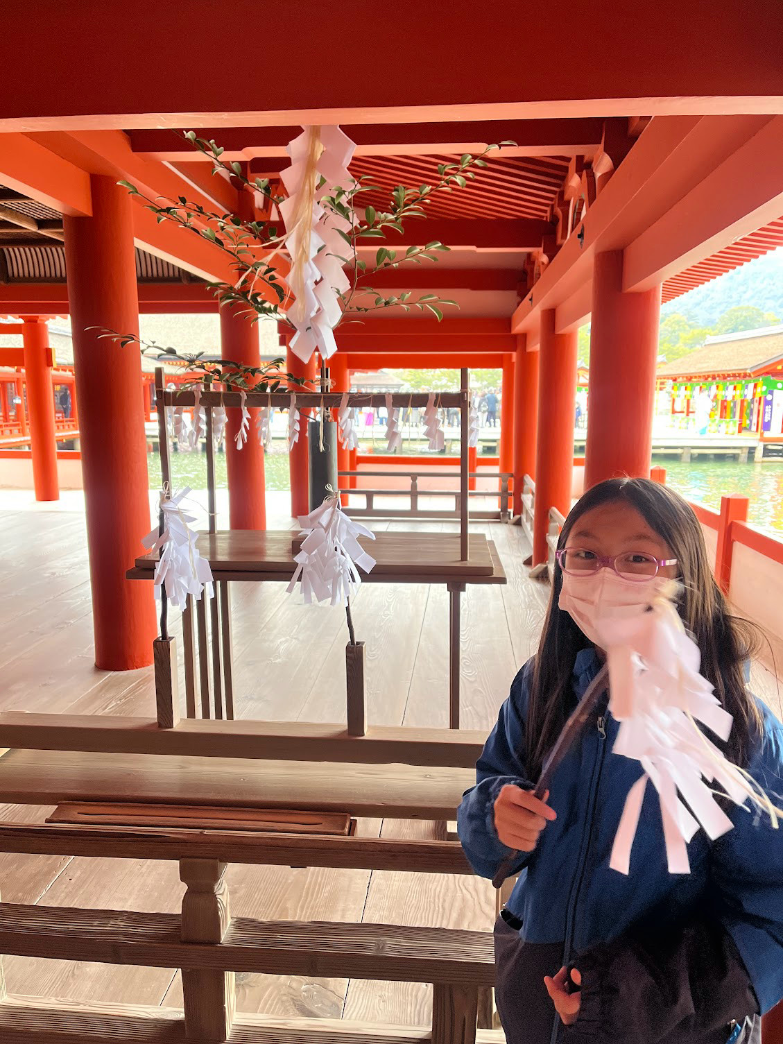 燕燕看到有幾根像是白紙垂做成的雞毛撢子放在一旁,我們也學著其他遊客一樣拿起來往身上揮動。後來查了才知道這個東西稱之為「大麻(おおぬさ)」,神職人員在神社儀式中會左右來回揮動,用以淨身除穢(お祓い)用的道具,大麻的概念是用來「吸附」身上或物體上的髒東西,然後還你一身乾淨。 接著就跟著走進迴廊,美麗的朱紅色廊柱相連的「東廻廊」氣氛莊嚴,走在裡面就有一種神聖的感覺。經過一處正在誦經祈福,齊齊跪坐的信徒,旁邊疊著標示清楚的貢品。