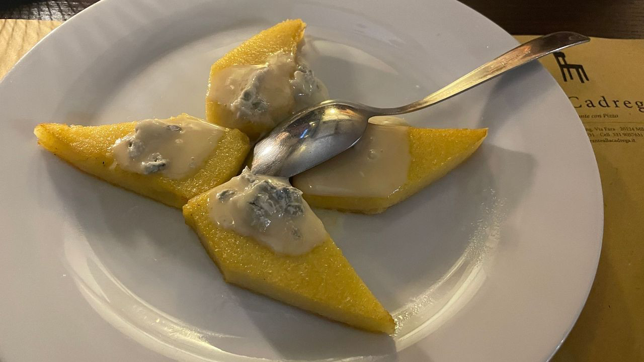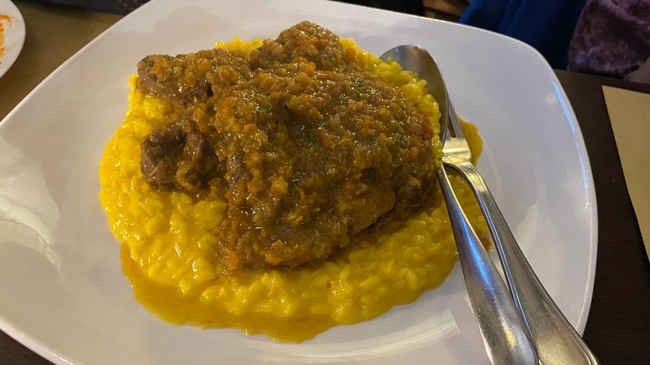 那天下著大雨,但澆不熄我們品嚐美食的野心。淋著雨走到離民宿隔一條街的餐廳,看到菜單上有燉牛小膝,真是皇天不負苦心人。肉質果然軟嫩,滋味濃郁細緻,不虧為米蘭名菜。