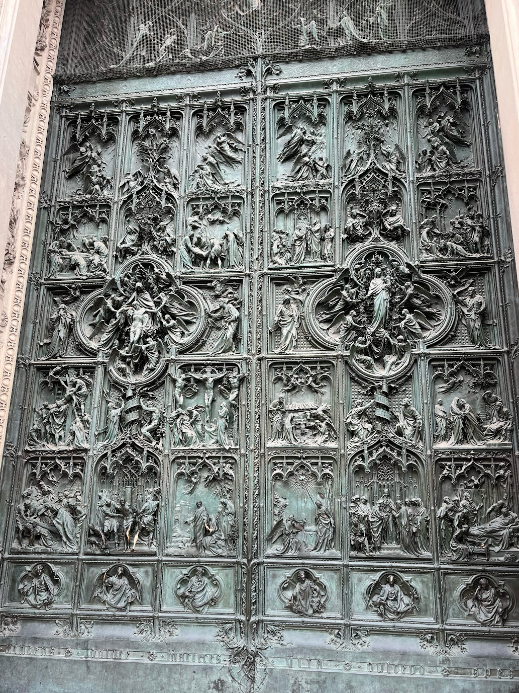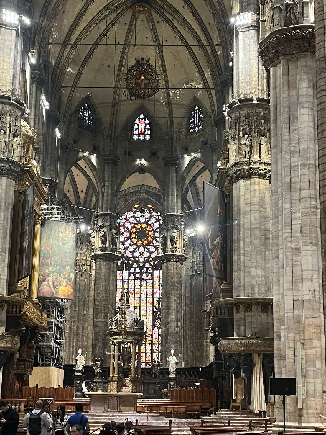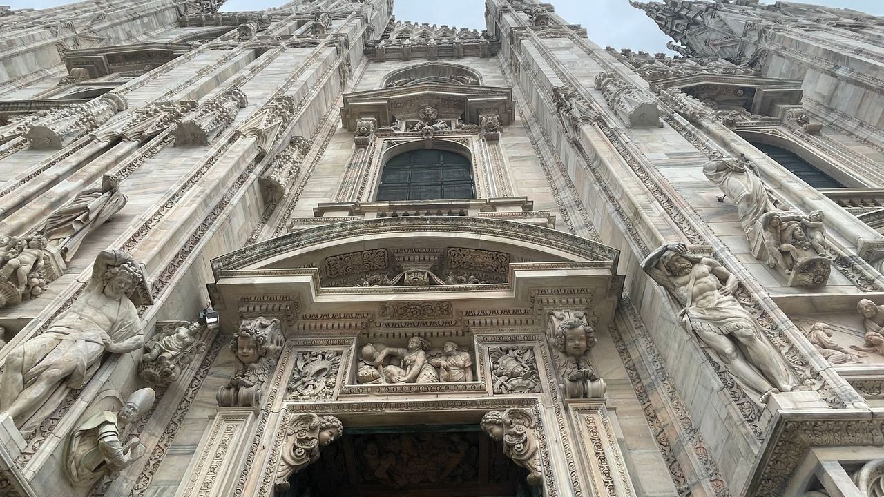 米蘭在二戰時期受到砲火慘烈的轟擊,不像羅馬、威尼斯、佛羅倫斯保留比較多古蹟建築,但是卻擁有米蘭大教堂。這座橫跨六百年才完工的標誌性建築,始建於1386年,直至1965年米蘭大教堂外牆中央的青銅色大門裝上後,才正式宣告落成。歷經六世紀之久,米蘭大教堂融合了古典、巴洛克、哥德式風格,做工精細繁複,造型壯觀華麗。