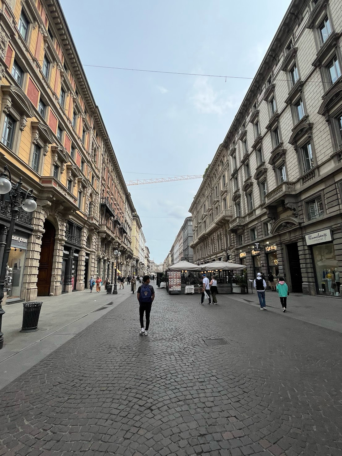 艾曼紐二世迴廊正中央有一個八角型的圓頂,旁邊配有美洲、歐洲、非洲、亞洲四大洲圖畫,讓商業氣息濃厚的精品街添增一些古典風味,彷彿逛藝術館那樣華麗又優雅。Louis Vuitton、Prada、Gucci、Chanel 等精品林立,還有咖啡店、甜點店等等。