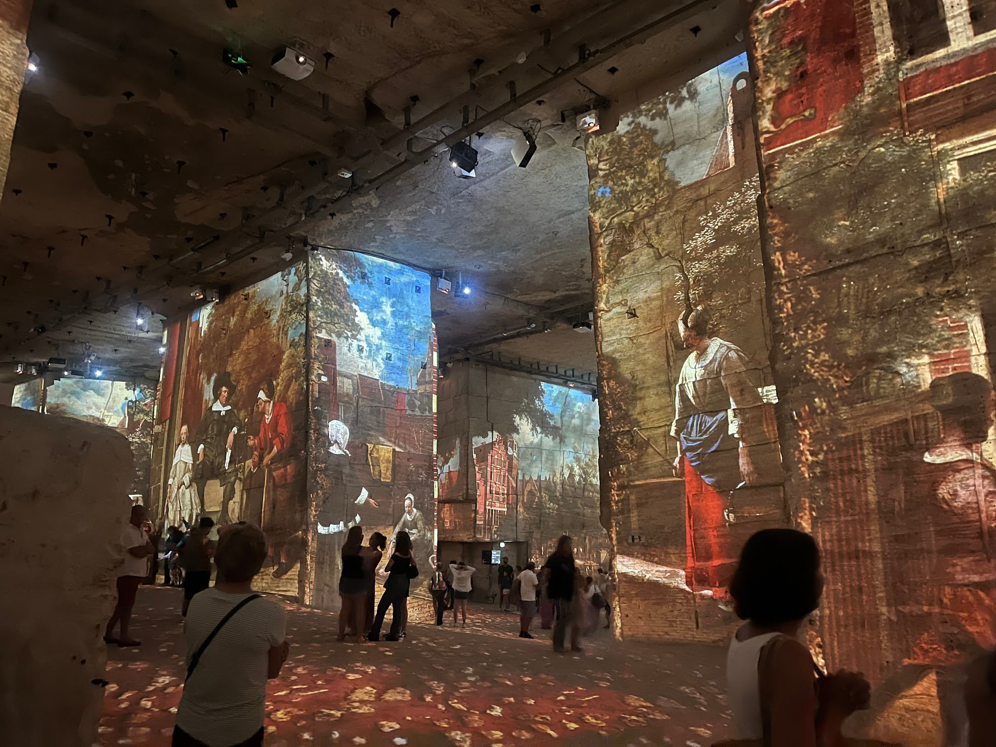 我們觀賞的展覽是《從維梅爾到梵谷 - 荷蘭大師們》以及《蒙德里安 - 色彩的建築師》。投影映照在高聳的石灰岩牆面上,隨著音樂節奏流轉移動,作品彷彿被注入生命。坐在石地上、聽著古典與現代音樂混合的旋律,看光影包圍整個空間,真的是一場難以言喻的感官饗宴